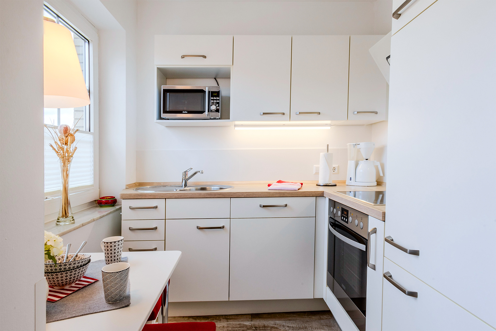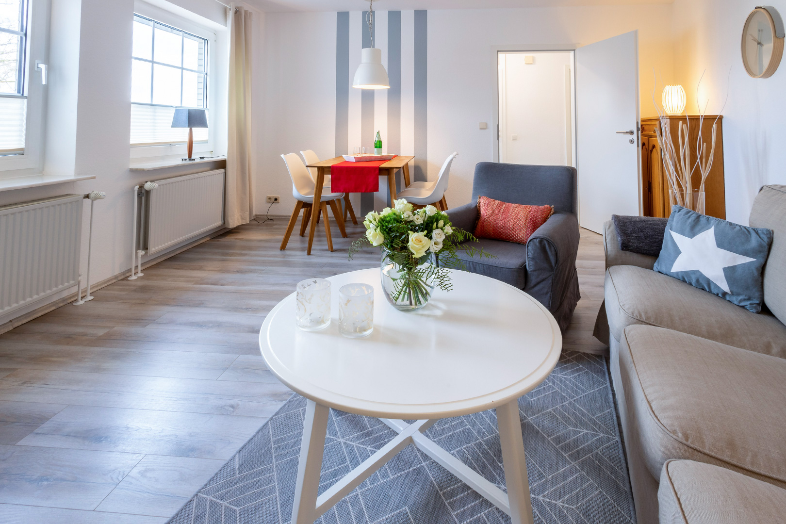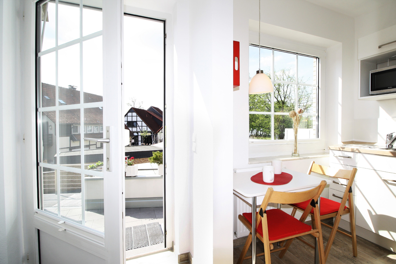 Das gemütliche Wohn-/Esszimmer mit Blick über die Dächer aufs Steinhuder Meer bietet Platz für unterhaltsame Abende oder ausgedehnte Mahlzeiten. Wenn's mal schnell gehen soll, können 2 Personen in der kleinen, offenen Küche essen, die mit einer Sitzecke ausgestattet ist. Grundsätzliche Dinge wie Salz, Pfeffer, Zucker, Küchentücher, Spülmittel etc. sind vorhanden. Es gibt 2 getrennte Schlafzimmer. Die Betten sind bei Ihrer Ankunft mit frisch gemangelter Bettwäsche bezogen. Das Tageslicht-Duschbad verfügt über eine bodengleiche Dusche mit schicken Glastüren und WC. Außerdem verfügt die Wohnung zusätzlich über ein zweites separates WC.