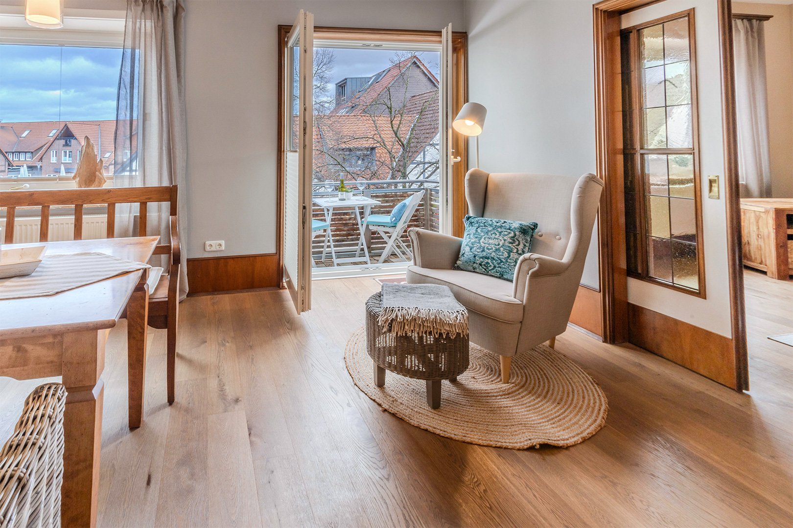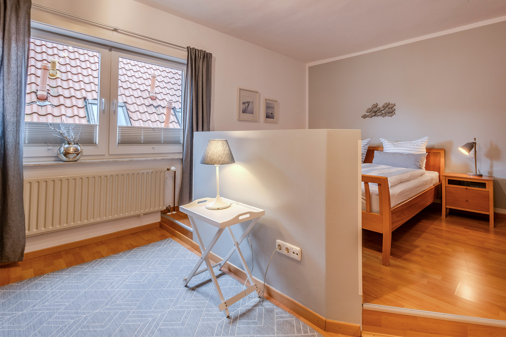 Die charakteristische Wohnung Zweisamkeit im modernen Landhaus-Stil liegt in einem Fachwerkhaus in der 1. Etage. Hohe, große Räume bieten viel Platz für Menschen, die es lieben, sich auch im Urlaub nicht einschränken zu müssen. Der kleine Aussichtsbalkon lädt ein, um bei einer Tasse Kaffee oder einem Glas Wein das Geschehen im Ortszentrum von Steinhude zu beobachten.